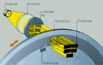 A durvább osztások letapogatása lényegében a ábrán bemutatott árnyékvetés elve szerint történik. A mértékmegtestesítő és egy letapogató rács egymáshoz képesti elmozdulása világos - sötét modulációt okoz, amit a fotóelemek érzékelnek